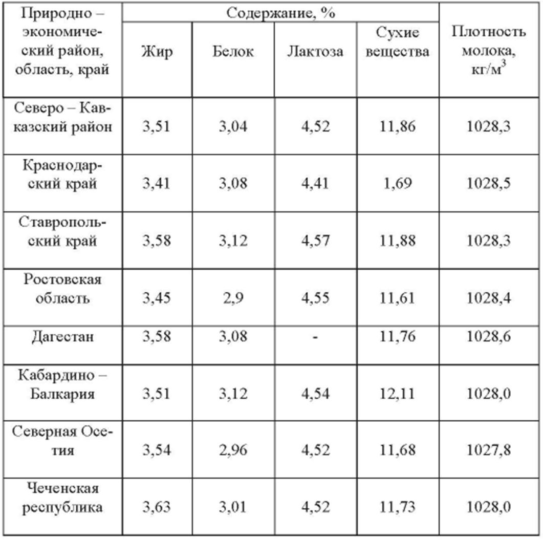 В табл. 2.1 отражены показатели состава молока, заготовляемого в различных регионах Северного Кавказа.