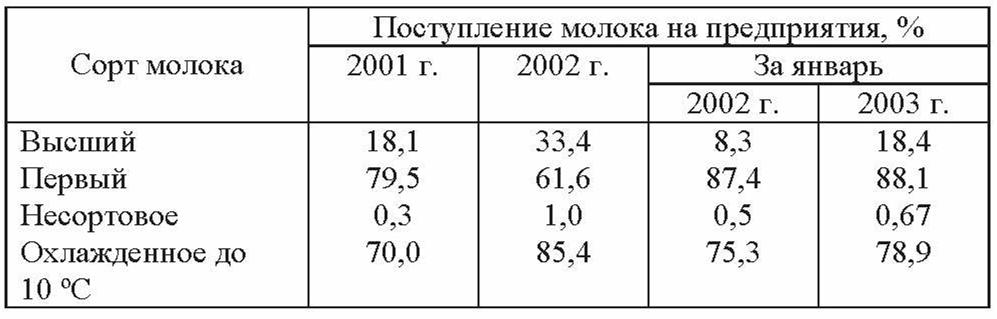 Только за январь 2003 г. высшим сортом принято 18,4 % молока, а за весь 2001 г. – 18,1 %.