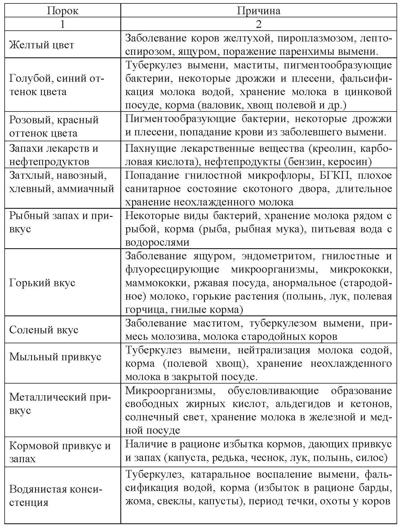 Некоторые пороки сырого молока и причины их вызывающие приведены в таблице 1.3.