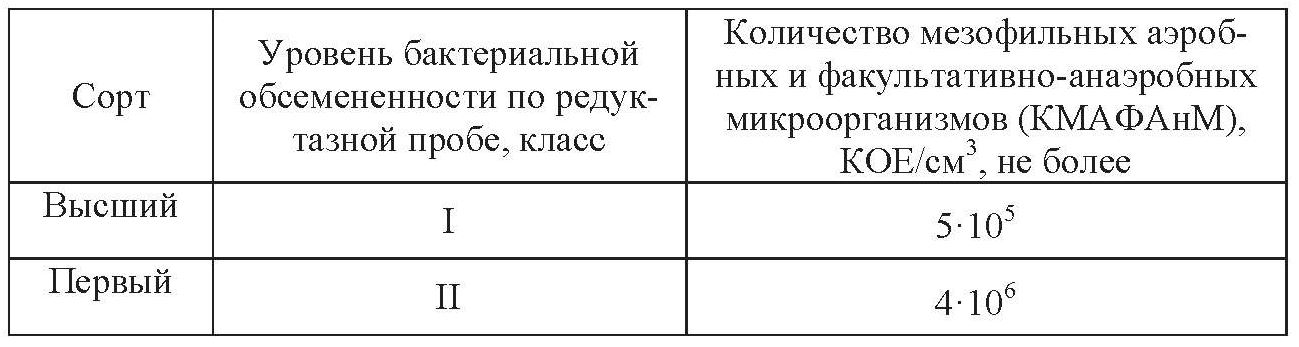 Примечание. Сливки с уровнем бактериальной обсемененности выше первого сорта, но не более 2-10' КОЕ/см3 допускаются к приемке вторым сортом с последующей переработкой на топленое масло или после двойной пастеризации и оценки ее эффективности на другие продукты в соответствии с требованиями законодательства Российской Федерации в области обеспечения санитарно-эпидемиологического благополучия населения. После пастеризации такие сливки по микробиологическим показателям должны соответствовать требованиям, установленным для пастеризованных сливок настоящим стандартом.