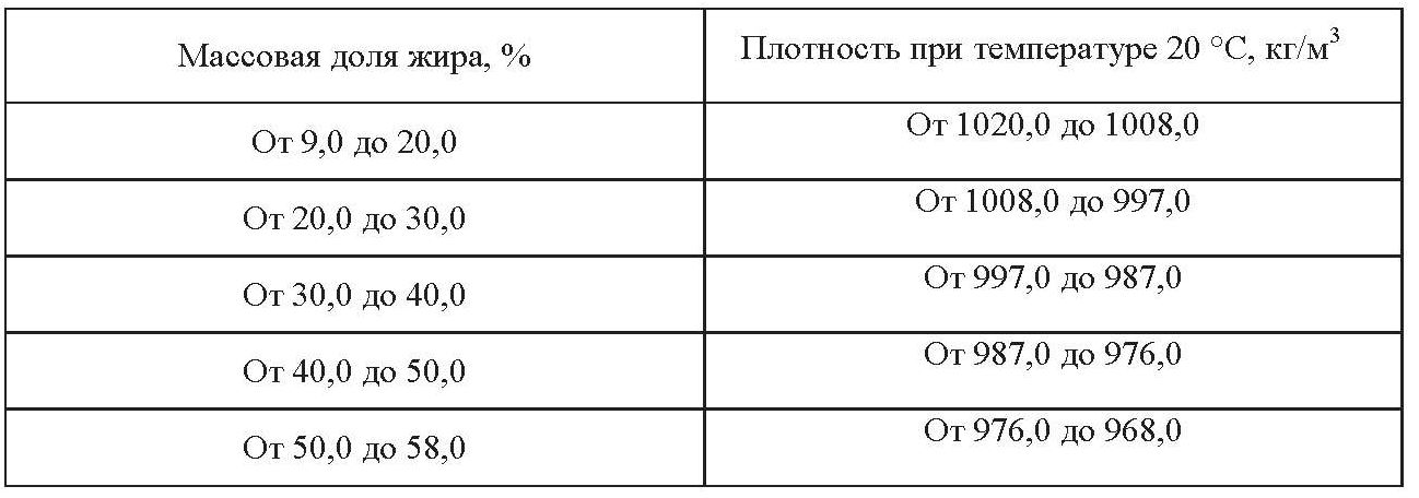 Таблица 2.5 – Плотность сливок в зависимости от жирности