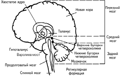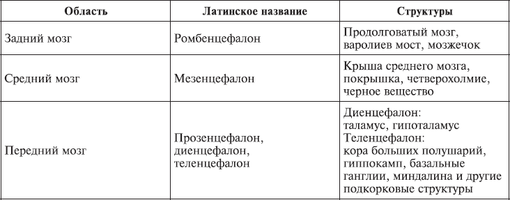 Головной мозг состоит из переднего, среднего и заднего (рис. 1.3; табл. 1.1). Передний мозг включает полушария мозга, покрытые корой, миндалину, гиппокамп, базальные ганглии, таламус и гипоталамус. Таламические поля и ядра обеспечивают переключение почти всей сенсорной и моторной информации, входящей и выходящей из переднего мозга. Гипоталамические поля и ядра служат релейными (передаточными) станциями для внутренних регуляторных систем. Средний мозг состоит из крыши среднего мозга, покрышки, четверохолмия, черного вещества. Задний мозг включает варолиев мост, продолговатый мозг, мозжечок. Поля и ядра моста и ствола отвечают за жизненно важную деятельность организма, контролируя дыхание и сердечный ритм. Мозжечок получает и анализирует информацию о положении тела в пространстве.