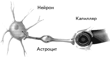 Рис. 1.14. На высоте активности нейрона, когда потребности в ионах натрия больше, чем это обеспечивает натрий-калиевый насос, астроцит действует как насос, перекачивая натрий из ближайшего сосуда (Kalat,1992).