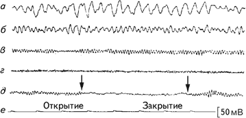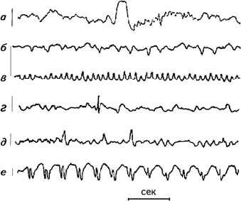 Рис. 2.4. Классификация волн ЭЭГ по частоте. Образцы дельта- (а), тета- (б), альфа- (в), и бета- (г) активности; (д) – блокада альфа-ритма при открытии глаз; (е) – отметка времени (Cooper, 1980).