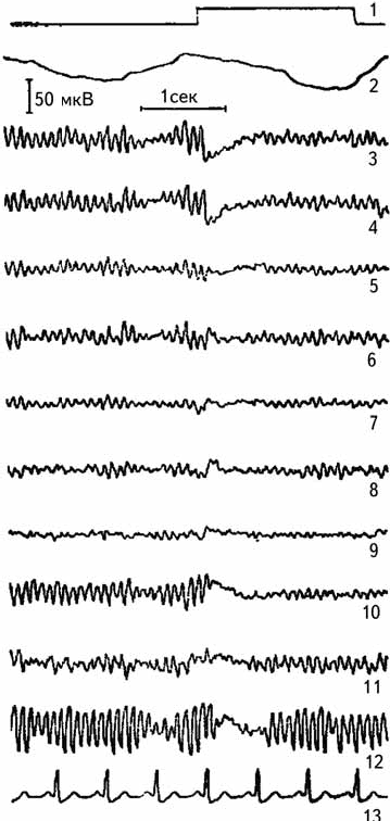 Рис. 2.6. Реакция депрессии альфа-ритма при непрерывном освещении глаза. 1 – отметка раздражителя, 2 – пневмограмма, 3–12 – униполярная регистрация ЭЭГ, 13 – ЭКГ (Лебедева, 1977).