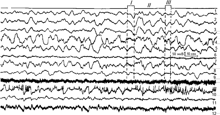 I – предъявление теста; II – этап сохранения; III – воспроизведение теста. 1, 2, 3 – вентролатеральное ядро зрительного бугра; 4 – скорлупа; 5, 6, 7 – бледный шар; 8 – красное ядро; 9 – внутренняя капсула; 10 – передневентральное ядро зрительного бугра; 11 – ретикулярное ядро зрительного бугра; 12 – срединный центр зрительного бугра. Регистрация на энцефалографе с постоянной времени 2,5 сек (Илюхина, 1977).