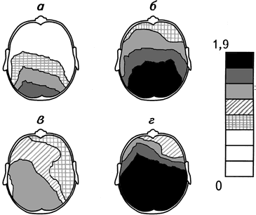 а, в – здоровые испытуемые, б, г – больные депрессией. Из каждой карты вычтена соответствующая ей фоновая карта. Справа – шкала амплитуд спектра мощности, мкВ (Михайлова, 1992).