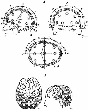 Для того чтобы результаты различных исследователей можно было сопоставлять, Международная федерация обществ ЭЭГ рекомендовала стандартный метод расположения электродов на поверхности скальпа – систему «10–20» (Jasper, 1958). В соответствии с требованиями этой системы производят три основных измерения: расстояние по сагиттальной линии между носовой впадиной и затылочным бугром, длину от одного наружного слухового прохода через макушку головы до другого во фронтальной плоскости, длину окружности головы. Каждая из этих величин принимается за 100 %. В продольном направлении лобный и затылочный электроды устанавливаются в точках, отстоящих от переносицы и затылочного бугра на расстоянии 10 % общего расстояния. Остальные 3 электрода располагаются на расстояниях 20 % от этих двух и друг от друга.