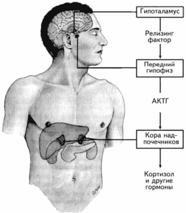 Стрессовую реакцию обеспечивают кортикостероиды. Стрессор, воздействуя на организм, вызывает активацию симпатического отдела гипоталамуса. Следствием этого является возбуждение чревного нерва и через него – мозгового слоя надпочечников, что и приводит к выбросу адреналина и норадреналина. Далее они с током крови направляются в особую область гипоталамуса, где находятся нейроны, продуцирующие адренокорт икотропинрелизинг-фактор, или адренокортиколиберин.