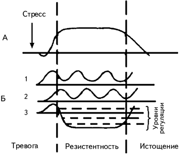 Рис. 3.4. Динамика взаимоотношений между содержанием в крови катехоламинов (1), глюкокортикоидов (2) и инсулина (3) в различные фазы стресса по Селье. А – изменение резистентности организма; Б – изменение концентрации адаптивных гормонов (Панин, 1983).