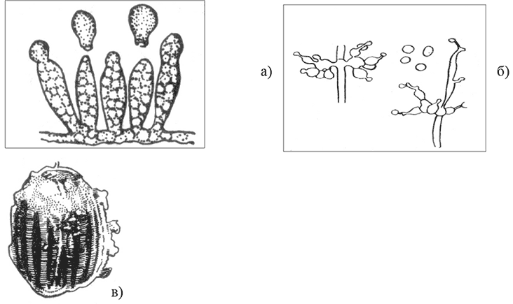 а) конидиеносцы гриба рода энтомофтора (Entomophthora sp.);
