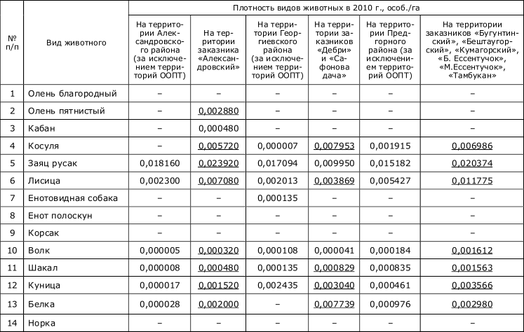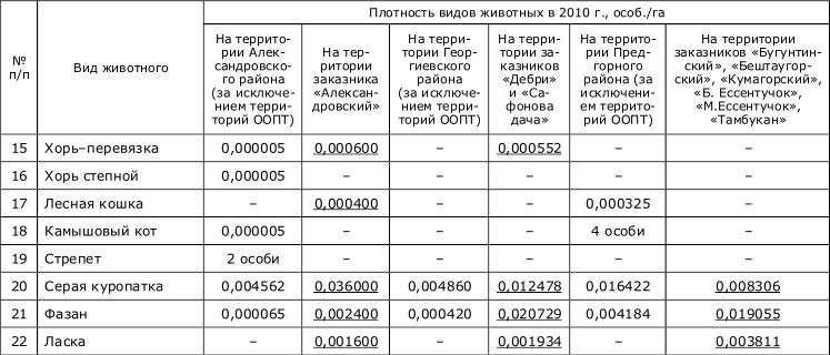 Примечание: данные плотности популяций животных представлены из расчета отношения численности их популяций к площадям муниципальных районов и площадям заказников Ставропольского края. Подчеркнуты показатели плотности популяций тех видов животных, которые превосходят таковые на территориях заказников по сравнению с остальной площадью муниципальных районов Ставропольского края.
