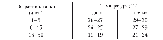 Оптимальная температура воздуха в помещении для суточных индюшат – 30–32 °C. В помещении устанавливают электробрудер (температура под которым в первую неделю должна составлять 35–30 °C (в помещении 30–28 °C), вторую-третью неделю – 29–25 °C (27–22 °C), четвертую-пятую – 24–21 °C (21–19 °C). После этого молодняк выращивают при температуре около 18 °C.