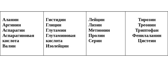 1. Незаменимые аминокислоты не могут синтезироваться животными организмами и обязательно поступают с пищей (аргинин, валин, гистидин, изолейцин, лейцин, метионин, фенилаланин, треонин).