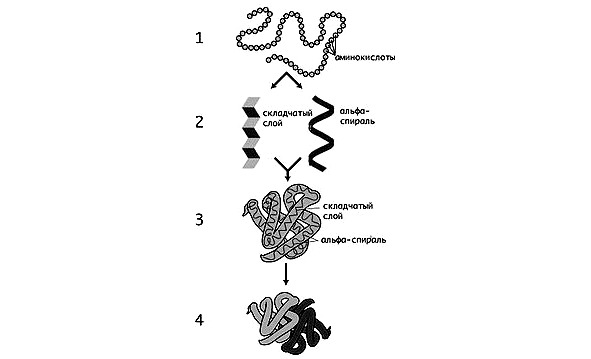 Рис. 3. Структура белка. 1. Первичная. 2. Вторичная. 3. Третичная. 4. Четвертичная.