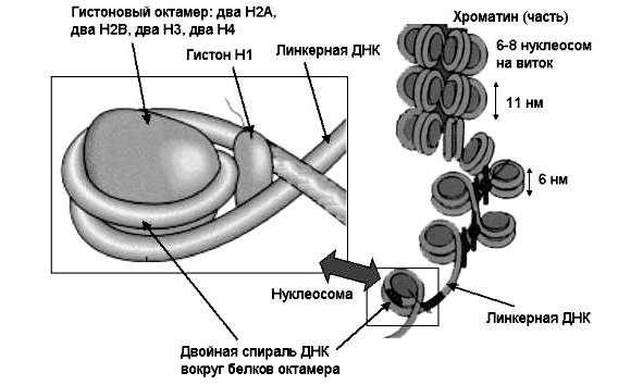 На молекулярном уровне гены образованы нуклеосомами и связывающми их фрагментами молекулы ДНК. Нуклеосома состоит из протеинового дискообразного остова, включающего 8 молекул (глобул) белков-гистонов: по 2 молекулы H2A, H2B, H3, H4. На него насажен виток молекулы ДНК, включающей 150 пар нуклеотидов. Нить ДНК непрерывно и последовательно связывает нуклеосомы, при этом межнуклеосомные участки называются линкерными и каждый из них содержит до 60 пар азотистых оснований. Полная нуклеосома включает собственно нуклеосому и примыкающий к ней линкерный участок, насчитывая таким образом, около 200 пар нуклеотидов.