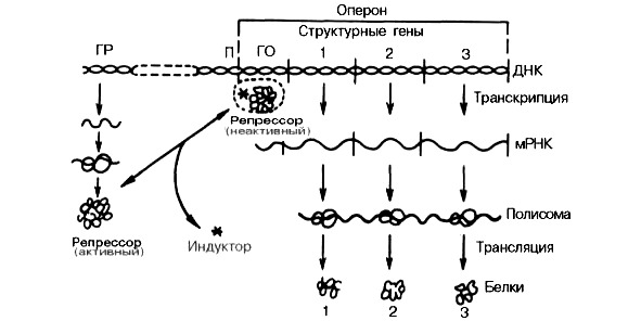 Основным условием существования любых живых организмов является наличие тонкой, гибкой и согласованно действующей системы регуляции, в которой все элементы тесно связаны друг с другом. В белковом синтезе определенное значение имеют не только количественный и качественный состав белков, но и параметры времени. Теорию генной регуляции синтеза белка разработали французские ученые Ф. Жакоб и Ж. Моно, удостоенные нобелевской премии (1965 г.). Для этого была использована культура бактерии кишечной палочки E. coli. Общая концепция состоит в способности этой бактерии включать или выключать систему генов в зависимости от наличия или отсутствия необходимой для жизнедеятельности бактерии лактозы (молочный сахар). Соответственно, система получила обозначение Lac-оперон (оперон – генетическая единица транскрипции). Она включает группу структурных и регуляторных генов.