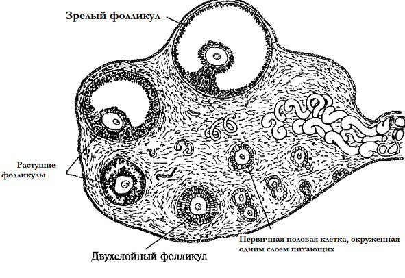 Рис. 29. Развитие фолликулов с половыми клетками в яичниках человека.