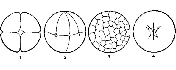 Характер дробления зависит от типа яйцевых клеток и загруженности овоцита желтком (см. рис. 35).