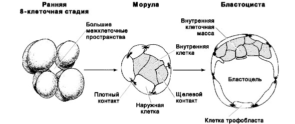 Развитие зиготы происходит путем ее последовательных митозов. Процесс этот называют дроблением, а образующиеся зародышевые клетки бластомерами. Дробление имеет ряд особенностей: митотический цикл характеризуется малой продолжительностью, в нем отсутствуют пре- и постсинтетические фазы, синтез белка до определенной стадии репрессирован. Поскольку постмитотического роста у зародышевых клеток нет, бластомеры уменьшаются в размерах и, хотя их общее число быстро увеличивается, объем зародыша на ранних стадиях развития существенно не меняется. В начале дробления бластомеры сходны между собой, в дальнейшем отдельные группы зародышевых клеток все более отличаются друг от друга, приобретают специфические черты. В процесс развития включаются факторы регуляции и морфологические факторы, связанные с дифференциальной активностью генов.