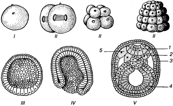 Рис. 37. Ранние стадии развития ланцетника. I – яйцеклетка, II – 2, 8, 32 бластомера, III – стадия бластулы, IV – гаструла, V – образование осевого комплекса органов: 1 – нервная пластинка, 2 – хорда, 3 – эктодерма, 4 – энтодерма, 5 – мезодерма.