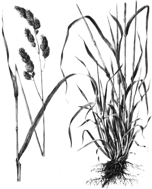 Многолетний рыхлокустовый верховой злак. Корневая система углубляется в почву до 1 м. Образует прямостоячий куст из обильных жестких генеративных, хорошо облиственных стеблей и прикорневых листьев высотой от 30 до 150 см. Стебли прочные, не полегают. Листья серо-зеленые, линейные, широкие (10 мм), с хорошо выраженным килем, обычно сложенные лодочкой, слегка шероховатые снизу и по краям, сверху гладкие (рис. 1.5).