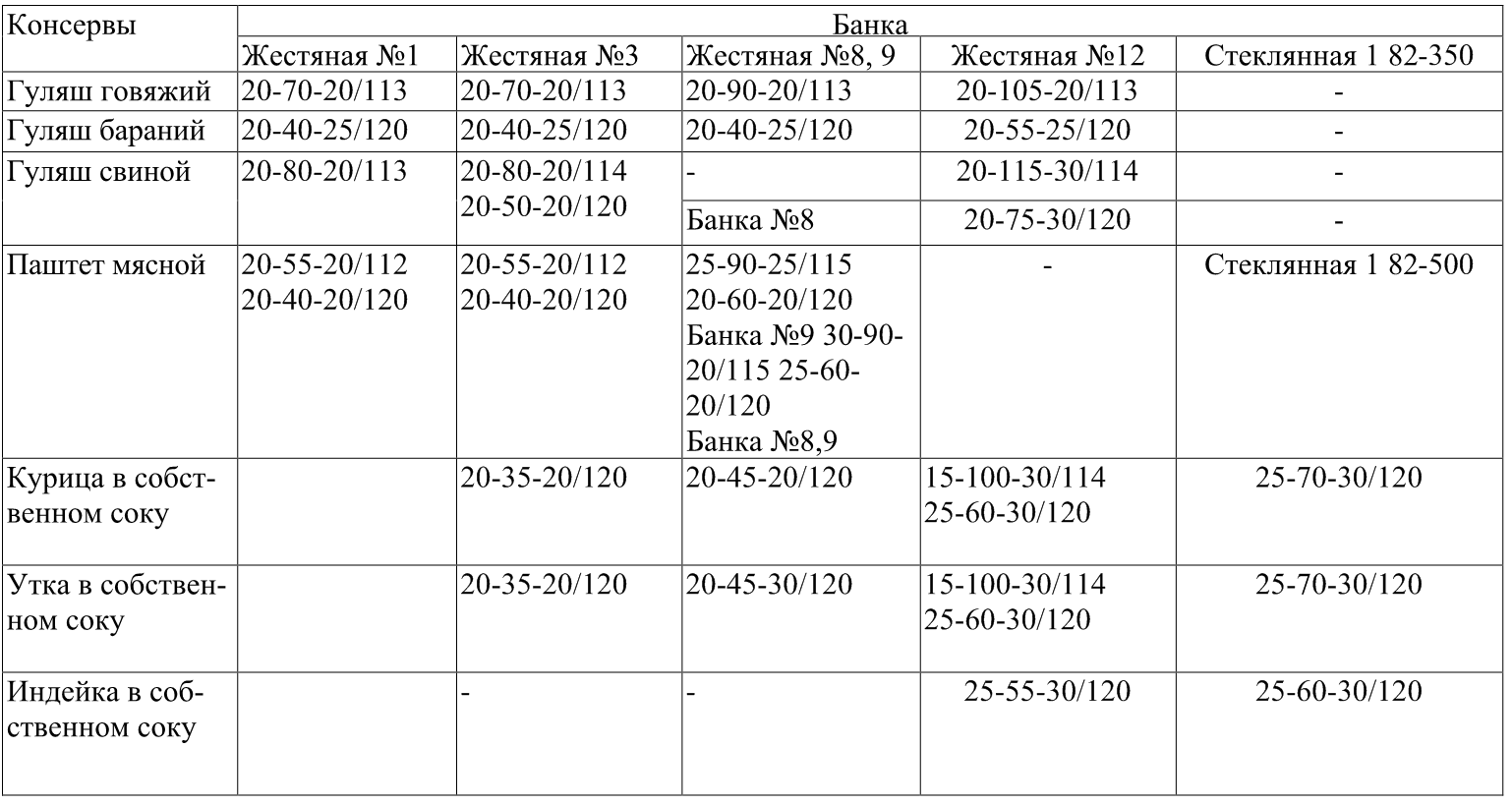 Таблица 1. Режимы стерилизации консервов