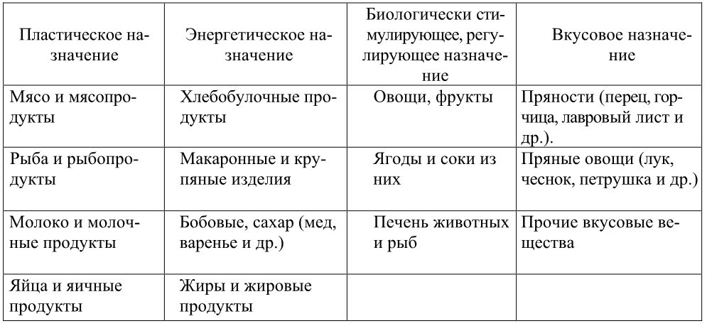Таблица 2. Преимущественное назначение пищевых продуктов