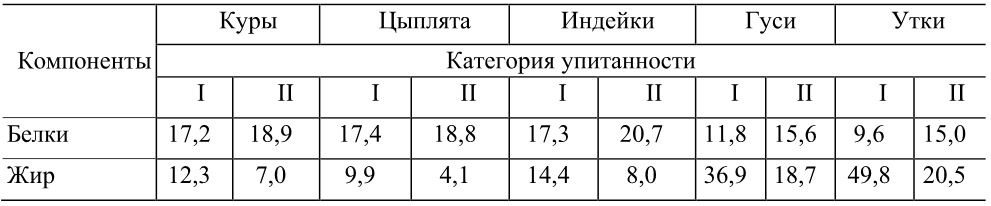 Таблица 5. Содержание белков и жира в съедобной части тушки, %