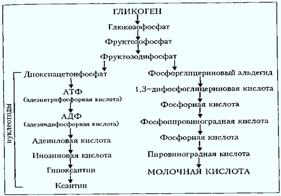 После убоя животного приток кислорода к клеткам мышечной ткани прекращается. В связи с этим синтез гликогена становится невозможным, а распад его под действием гликолитических ферментов происходит двумя путями: амилолитическим с образованием редуцирующих сахаров и гликолитическим (фосфоролиз) с образованием (в результате анаэробного гликолиза) молочной кислоты (схема 2). Одновременно из промежуточных фосфорных соединений освобождается фосфорная кислота. Накапливаются кислоты также и в процессе биохимических изменений нуклеотидов (распада АТФ).