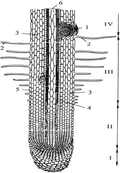 I – корневой чехлик, II – зона деления и зона растяжения, III – зона всасывания, IV – зона проведения; 1– зачаток бокового корня, 2 – корневые волоски, 3 – первичная кора, 4 – эндодерма, 5 – эпиблема, 6 – осевой цилиндр