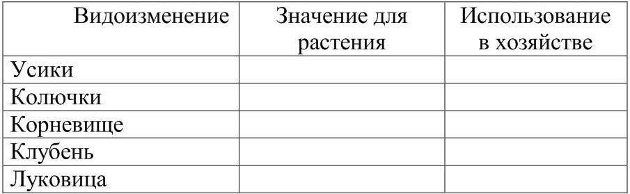 Охарактеризуйте видоизменения побегов, заполнив таблицу 10.