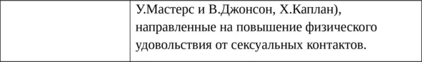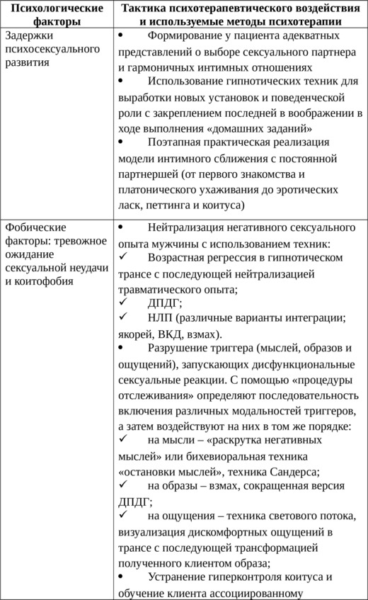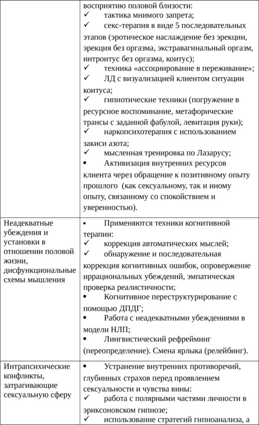 В арсенале опытных психологов множество методик. Одним из вариантов классификации методов и методик, применяемых в сексологии, является нижеследующая таблица, в которой в систематизированном порядке (с учетом основных точек приложения) представлены методы психотерапевтической помощи, используемые для коррекции сексуальных дисфункций у мужчин. В. Доморацким (2008) приведено описание методики их применения в виде тактики психотерапевтической коррекции ключевых психологических факторов сексуальной дезадаптации мужчины. Вот как, по мнению Л.Н.Скирдиной она выглядит в виде таблицы: