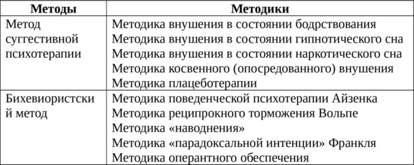 Психоаналитики применяют, например, методику ортодоксального психоанализа Фрейда, методику индивидуальной психологии Адлера, аналитической психологии Юнга, ускоренного психоанализа Штекеля и другие. Сторонники метода саморегуляции предпочитают методики: прогрессивной мышечной релаксации по Джейкобсону, самовнушения по Куэ, аутотренинга Шульца, направленной органотренировки Клюмбес-Кляйнзорге, методику биологической обратной связи. Соответственно, каждому методу работы соответствуют определенные методики:
