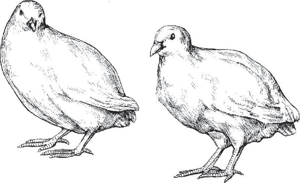 Имеют белое оперение (иногда встречаются отдельные черные перья), темные глаза.