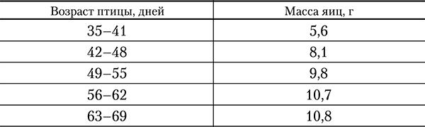 В зависимости от возраста ежемесячная продуктивность составляет в первый месяц от 8, а в следующие месяцы до 25 яиц яйцекладки. В начале масса яиц не превышает 7 г, затем, постепенно увеличиваясь, достигает 10–12 г к 2-месячному возрасту (табл. 3).
