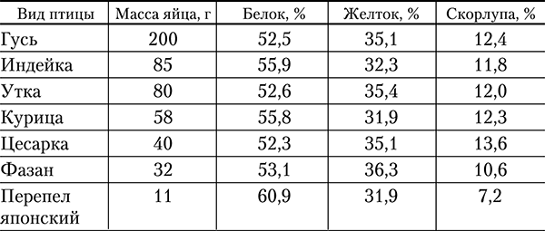 Таблица 4. Соотношение основных частей яиц птиц