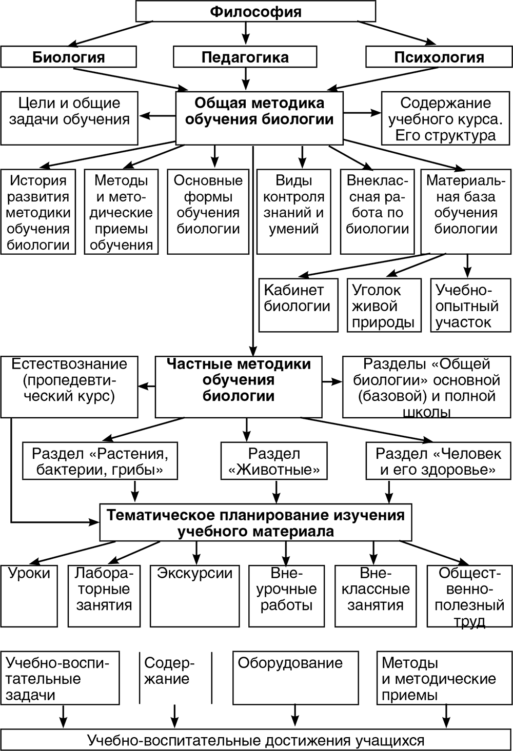Один из важных критериев любой науки – связь с другими науками. Методика обучения биологии связана с философией, биологией, педагогикой, психологией и некоторыми другими науками (рис. 1). Философия – методологическая основа любой науки. Методика обучения биологии в наибольшей степени связана с диалектикой. Для обучения подрастающего поколения она отбирает те научные принципы, идеи и теории, которые правильно отражают объективную действительность и на основе которых можно формировать у школьников подлинно естественнонаучное мировоззрение. Использование диалектического материализма дает возможность избежать различных методологических ошибок: отбор учебного материала, например, нельзя ставить в зависимость от методов обучения; содержание любого раздела школьного курса биологии должно рассматриваться в зависимости от его учебно-воспитательных задач, методы обучения – в зависимости от учебно-воспитательных задач и содержания учебного материала, формы обучения и оборудование – в зависимости от содержания и методов. Вместе с тем, определение задач и содержания курса биологии должно рассматриваться в зависимости от потребностей общества, развития биологической науки, возможностей усвоения учащимися предлагаемых знаний в соответствии с их возрастом и развитием. Процесс обучения необходимо строить в развитии от урока к уроку, от темы к теме, от одного раздела программы к последующему.