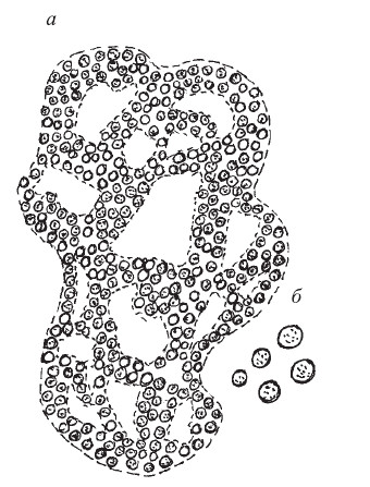 Рис. 1.1. Microcystis. Общий вид колонии (а) и отдельные клетки (б)