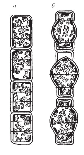 Рис. 1.14. Melosira: а – общий вид колонии (клетки видны с пояска); б – колонии с ауксоспорами