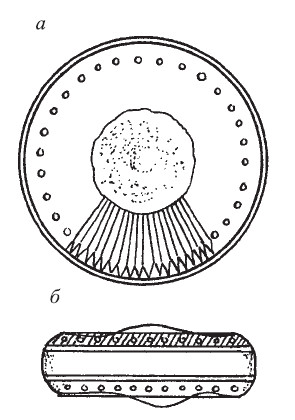 Рис. 115, Cyclotella: а, б – вид со створки и с пояска соответственно