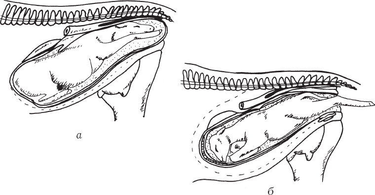 Рис. 38. Правильное положение плода: а – головное предлежание; б – тазовое предлежание