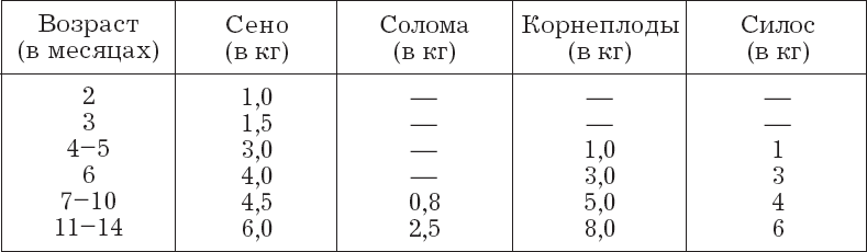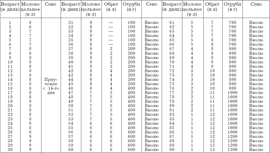 Ведро для кормления должно быть чистым, перед заполнением молоком оно обдается кипятком. Поить можно с помощью сосковых поилок, а можно приучить его пить прямо из ведра. Делают это следующим образом. Чисто моют руки, дают два пальца теленку в рот, после того как он начнет сосать, опускают руку, не вынимая пальцев изо рта, в ведро с молоком. Теленок сосет пальцы, а вместе с этим молоко попадает к нему в рот. Два-три раза проделайте это упражнение, и теленок начнет пить молоко сам. После кормления мордочку теленка надо вымыть и вытереть. В случае, если малыш начинает сосать прутья клетки или подстилку, можно надеть ему намордник из прутьев деревьев. По окончании молозивного периода теленка переводят на четырехкратное кормление материнским молоком, и продолжается это две недели. Затем теленку можно давать молоко любой здоровой коровы. Молочный период продолжается 5–6 недель, после чего цельное молоко заменяют обратом и начинают подкармливать малыша твердыми кормами. Примерные нормы кормов в постмолочный период указаны в табл. 3.