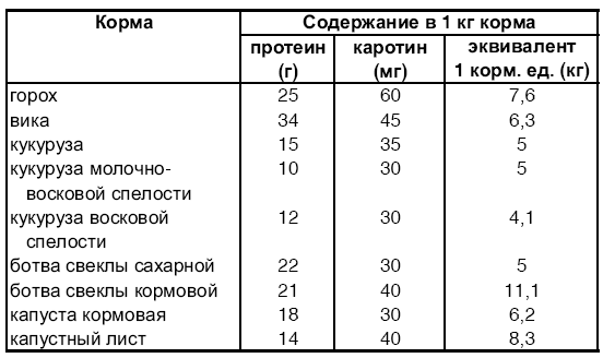 Для сбалансированного питания животного важно включать в рацион зеленые корма: зеленую массу клевера, гороха, люцерны, викоовсяной смеси, свекольную ботву, молодую крапиву, лебеду, одуванчик, показанные в табл. 4.