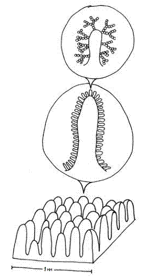 Такий перфекціоніст, як тонка кишка, на цьому не зупиняється. В одному квадратному міліметрі кишкової оболонки є тридцять крихітних ворсинок. Ці ворсинки дуже малі, ми майже можемо їх бачити – але тільки майже. Кордон між видимим і невидимим настільки розмитий, що ми просто бачимо лише оксамитову структуру. Малі ворсинки під мікроскопом виглядають як великі хвилі з прозорих клітин (дуже схоже на оксамит). Якщо дивитися через кращий мікроскоп, можна побачити, що кожна з цих клітин повністю вкрита прозорими кудлатими виступами. Ворсинка до ворсинки, так би мовити. Ці ворсинки, у свою чергу, мають оксамитову обшивку, утворену незліченними формуваннями цукру, які схожі формою на оленячі роги, – це так званий глікокалікс. Якби все було розгладженим (складки, ворсинки і ворсинки на ворсинках), наш кишечник складав би близько семи кілометрів.