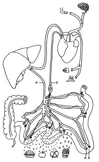 А – кровоносні судини проходять крізь печінку, а потім ідуть до серця. B – лімфатичні судини ведуть прямо до серця.