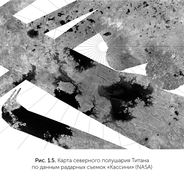 Титан уникален среди всех спутников тем, что он имеет плотную атмосферу. Кроме того, Титан – единственное кроме Земли тело Солнечной системы с озерами и реками на поверхности (рис. 1.5). Правда, при температуре ?170 °C эти озера и реки состоят из жидких углеводородов (метана и этана) и текут по скалам из водяного льда. Атмосфера Титана состоит из азота с примесью метана. Под действием ультрафиолета в верхних слоях атмосферы образуются сложные углеводороды, которые создают желтую дымку, скрывающую поверхность спутника.