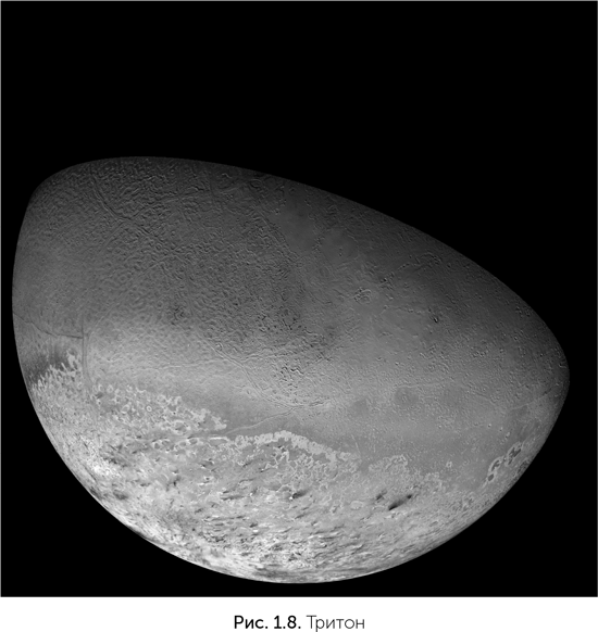 В системе Нептуна есть один крупный спутник – Тритон (рис. 1.8.) диаметром 2700 км (несколько меньше Луны), семь мелких внутренних спутников, очень близких к планете, и пять удаленных от планеты мелких нерегулярных спутников. Тритон обращается вокруг Нептуна в обратном направлении, как нерегулярный спутник, хотя его орбита практически круговая и наклонена лишь на 24 градуса относительно экватора планеты. Его плотность 2,07 г/м? свидетельствует о большой доле каменных пород по сравнению с другими спутниками Урана и Нептуна. Состав Тритона и характер его орбиты заставляют предположить, что раньше Тритон был самостоятельной карликовой планетой, вроде Плутона, и был захвачен Нептуном при сближении. На поверхности Тритона заметны следы тектонической активности и гейзеры, извергающие азот. Активность этих гейзеров поддерживает разреженную азотную атмосферу, ее давление примерно в 50 000 раз ниже давления атмосферы Земли.