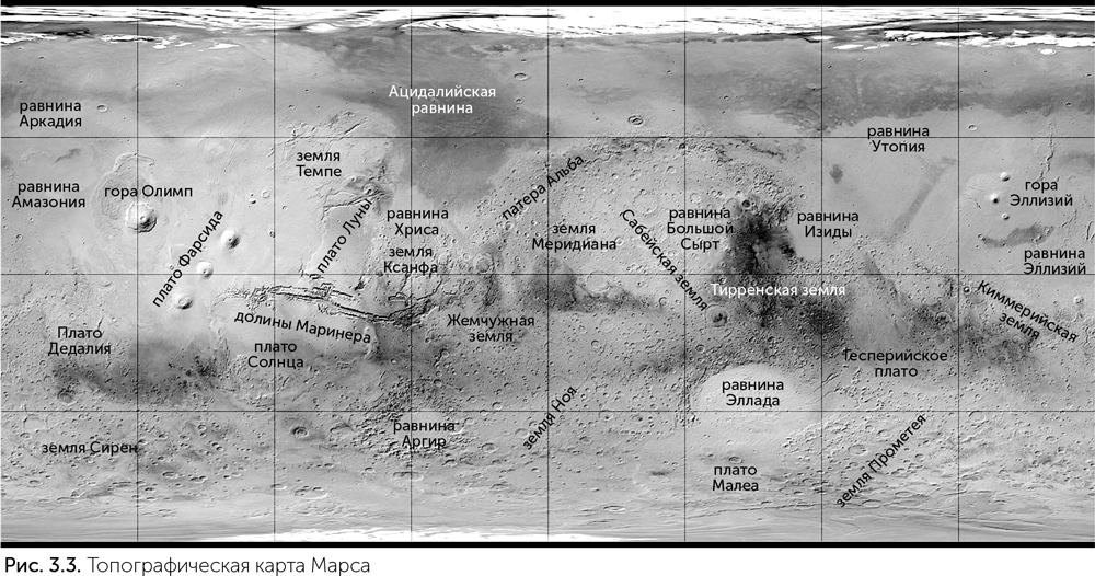 В отличие от Земли Марс сохранил большие блоки планетарной коры со времен до поздней тяжелой бомбардировки. На карте Марса четко выделяются два полушария – возвышенное южное, густо покрытое метеоритными кратерами, и низкое, гладкое северное. Перепад высот между ними составляет 4–6 км. По плотности кратеров очевидно, что поверхность южного полушария древнее 3,9 млрд лет, так как сохранила следы поздней тяжелой бомбардировки, а северное моложе этой отметки. Крупнейший из кратеров, дно которого получило название равнины Эллада, находится в высоких широтах южного полушария и достигает 1800 км в диаметре. Это самая низкая область поверхности Марса, на 8 км ниже среднего уровня. Измерения при помощи лазерного альтиметра зонда Mars Global Surveyor позволили найти едва различимые, вероятно, засыпанные осадками крупные кратеры в северном полушарии. Крупнейший из них, равнина Утопия, практически равен по размеру равнине Эллада. С учетом этих кратеров получается, что кора северного полушария не намного моложе южной (рис. 3.3).