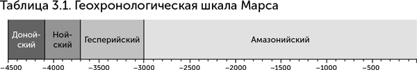 Амазонийский период (примерно с 3 млрд лет назад и до современного периода) был временем затухания геологической активности и исчезновения жидкой воды с поверхности Марса. Основными геологическими процессами этого периода являются ветровая эрозия, перемещение пыли, формирование ветровых осадков и ледниковые процессы. Граница между Гесперийским и Амазонийским периодами достаточно приблизительна, и некоторые ученые сдвигают ее до времени 2,5–2 млрд лет назад (табл. 3.1).